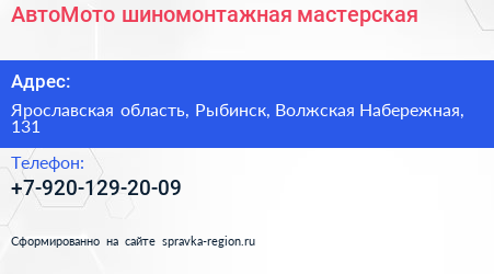 АвтоМото, шиномонтажная мастерская по адресу Ярославская область, Рыбинск, Волжская Набережная, 131 в дальнейшем Организация, размещена в следующих категориях: