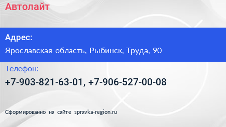 Автолайт по адресу Ярославская область, Рыбинск, Труда, 90 в дальнейшем Организация, размещена в следующих категориях: