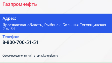 Газпромнефть по адресу Ярославская область, Рыбинск, Большая Тоговщинская 2-я, 34 в дальнейшем Организация, размещена в следующих категориях:
