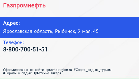 Газпромнефть по адресу Ярославская область, Рыбинск, 9 мая, 45 в дальнейшем Организация, размещена в следующих категориях:
