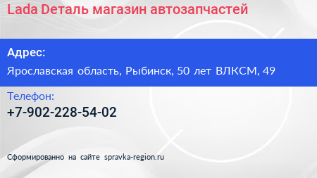 Lada Dеталь, магазин автозапчастей по адресу Ярославская область, Рыбинск, 50 лет ВЛКСМ, 49 в дальнейшем Организация, размещена в следующих категориях: