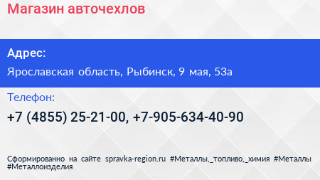 Магазин авточехлов по адресу Ярославская область, Рыбинск, 9 мая, 53а в дальнейшем Организация, размещена в следующих категориях: