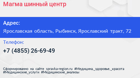 Магма, шинный центр по адресу Ярославская область, Рыбинск, Ярославский тракт, 72 в дальнейшем Организация, размещена в следующих категориях: