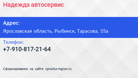 Надежда, автосервис по адресу Ярославская область, Рыбинск, Тарасова, 55а в дальнейшем Организация, размещена в следующих категориях: