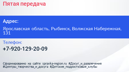Пятая передача по адресу Ярославская область, Рыбинск, Волжская Набережная, 131 в дальнейшем Организация, размещена в следующих категориях: