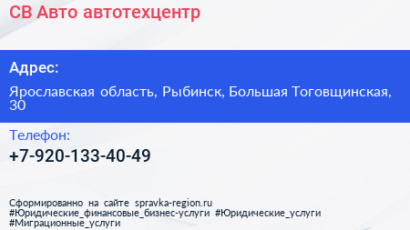 СВ Авто, автотехцентр по адресу Ярославская область, Рыбинск, Большая Тоговщинская, 30 в дальнейшем Организация, размещена в следующих категориях: