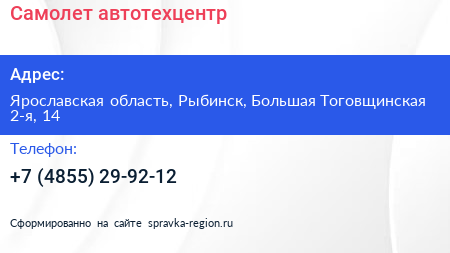 Самолет, автотехцентр по адресу Ярославская область, Рыбинск, Большая Тоговщинская 2-я, 14 в дальнейшем Организация, размещена в следующих категориях: