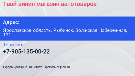 Твой винил, магазин автотоваров по адресу Ярославская область, Рыбинск, Волжская Набережная, 131 в дальнейшем Организация, размещена в следующих категориях: