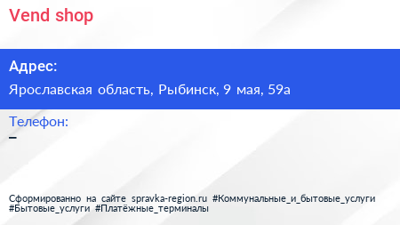 Vend shop по адресу Ярославская область, Рыбинск, 9 мая, 59а в дальнейшем Организация, размещена в следующих категориях: