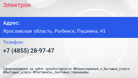 Электрон по адресу Ярославская область, Рыбинск, Пушкина, 41 в дальнейшем Организация, размещена в следующих категориях: