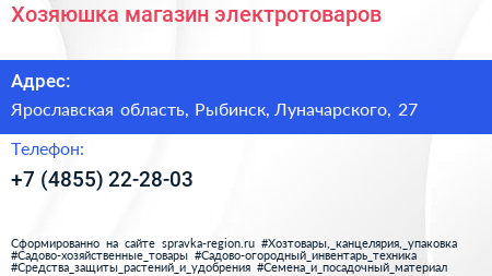 Хозяюшка, магазин электротоваров по адресу Ярославская область, Рыбинск, Луначарского, 27 в дальнейшем Организация, размещена в следующих категориях:
