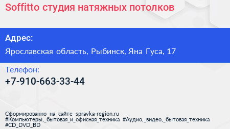 Soffitto, студия натяжных потолков по адресу Ярославская область, Рыбинск, Яна Гуса, 17 в дальнейшем Организация, размещена в следующих категориях: