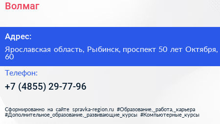 Волмаг по адресу Ярославская область, Рыбинск, проспект 50 лет Октября, 60 в дальнейшем Организация, размещена в следующих категориях: