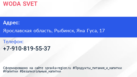WODA SVET по адресу Ярославская область, Рыбинск, Яна Гуса, 17 в дальнейшем Организация, размещена в следующих категориях: