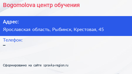 Bogomolova, центр обучения по адресу Ярославская область, Рыбинск, Крестовая, 45 в дальнейшем Организация, размещена в следующих категориях:
