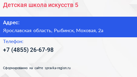 Детская школа искусств №5 по адресу Ярославская область, Рыбинск, Моховая, 2а в дальнейшем Организация, размещена в следующих категориях: