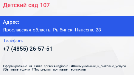 Детский сад №107 по адресу Ярославская область, Рыбинск, Нансена, 28 в дальнейшем Организация, размещена в следующих категориях:
