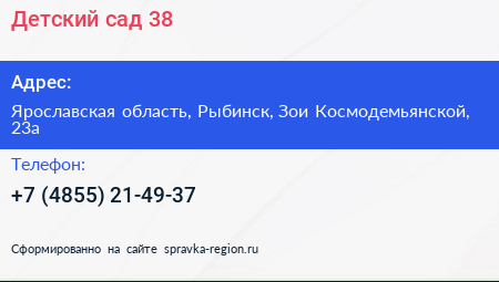 Детский сад №38 по адресу Ярославская область, Рыбинск, Зои Космодемьянской, 23а в дальнейшем Организация, размещена в следующих категориях: