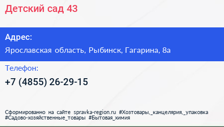 Детский сад №43 по адресу Ярославская область, Рыбинск, Гагарина, 8а в дальнейшем Организация, размещена в следующих категориях: