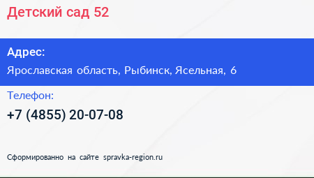 Детский сад №52 по адресу Ярославская область, Рыбинск, Ясельная, 6 в дальнейшем Организация, размещена в следующих категориях: