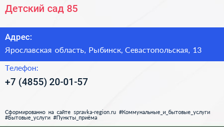 Детский сад №85 по адресу Ярославская область, Рыбинск, Севастопольская, 13 в дальнейшем Организация, размещена в следующих категориях: