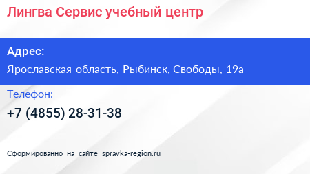 Лингва-Сервис, учебный центр по адресу Ярославская область, Рыбинск, Свободы, 19а в дальнейшем Организация, размещена в следующих категориях: