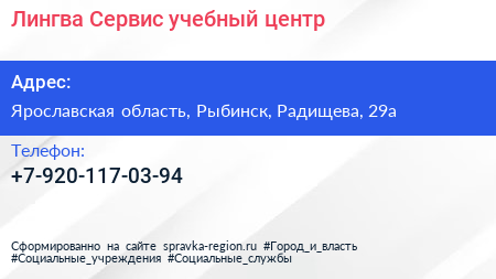 Лингва-Сервис, учебный центр по адресу Ярославская область, Рыбинск, Радищева, 29а в дальнейшем Организация, размещена в следующих категориях: