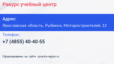 Ракурс, учебный центр по адресу Ярославская область, Рыбинск, Моторостроителей, 12 в дальнейшем Организация, размещена в следующих категориях:
