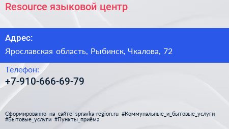 Resource, языковой центр по адресу Ярославская область, Рыбинск, Чкалова, 72 в дальнейшем Организация, размещена в следующих категориях:
