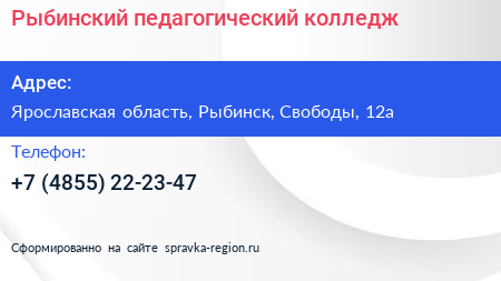 Рыбинский педагогический колледж по адресу Ярославская область, Рыбинск, Свободы, 12а в дальнейшем Организация, размещена в следующих категориях:
