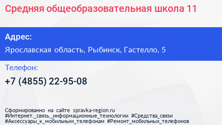 Средняя общеобразовательная школа №11 по адресу Ярославская область, Рыбинск, Гастелло, 5 в дальнейшем Организация, размещена в следующих категориях: