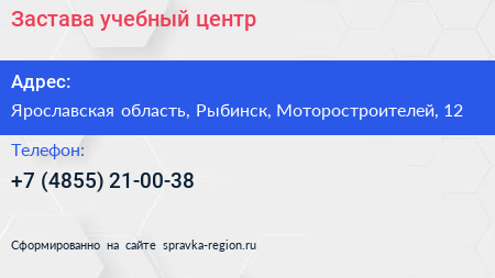 Застава, учебный центр по адресу Ярославская область, Рыбинск, Моторостроителей, 12 в дальнейшем Организация, размещена в следующих категориях: