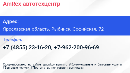 AmRex, автотехцентр по адресу Ярославская область, Рыбинск, Софийская, 72 в дальнейшем Организация, размещена в следующих категориях: