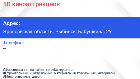 5D, киноаттракцион по адресу Ярославская область, Рыбинск, Бабушкина, 29 в дальнейшем Организация, размещена в следующих категориях: