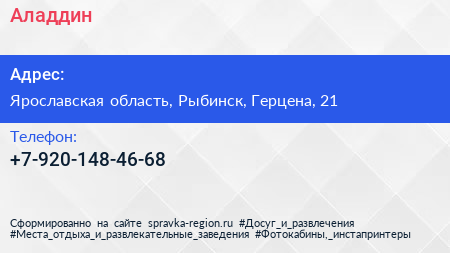 Аладдин по адресу Ярославская область, Рыбинск, Герцена, 21 в дальнейшем Организация, размещена в следующих категориях: