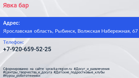 Явка, бар по адресу Ярославская область, Рыбинск, Волжская Набережная, 67 в дальнейшем Организация, размещена в следующих категориях: