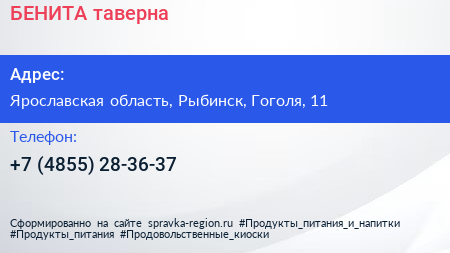 БЕНИТА, таверна по адресу Ярославская область, Рыбинск, Гоголя, 11 в дальнейшем Организация, размещена в следующих категориях: