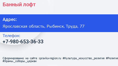 Банный лофт по адресу Ярославская область, Рыбинск, Труда, 77 в дальнейшем Организация, размещена в следующих категориях:
