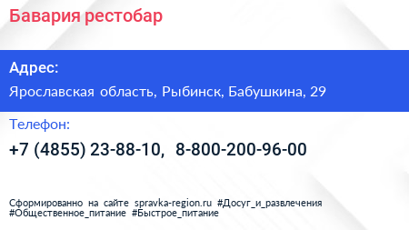 Бавария, рестобар по адресу Ярославская область, Рыбинск, Бабушкина, 29 в дальнейшем Организация, размещена в следующих категориях: