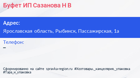 Буфет, ИП Сазанова Н.В. по адресу Ярославская область, Рыбинск, Пассажирская, 1а в дальнейшем Организация, размещена в следующих категориях: