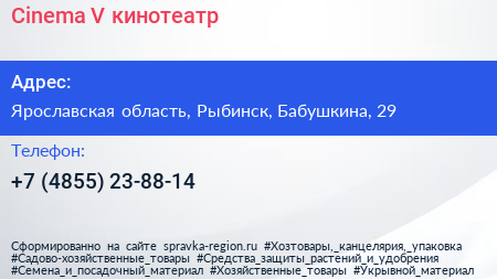 Cinema V, кинотеатр по адресу Ярославская область, Рыбинск, Бабушкина, 29 в дальнейшем Организация, размещена в следующих категориях:
