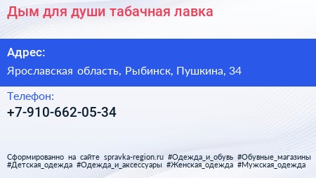Дым для души, табачная лавка по адресу Ярославская область, Рыбинск, Пушкина, 34 в дальнейшем Организация, размещена в следующих категориях: