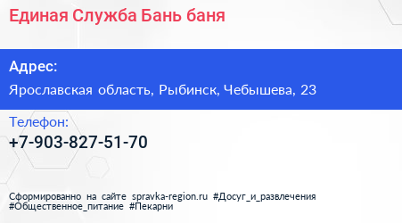 Единая Служба Бань, баня по адресу Ярославская область, Рыбинск, Чебышева, 23 в дальнейшем Организация, размещена в следующих категориях: