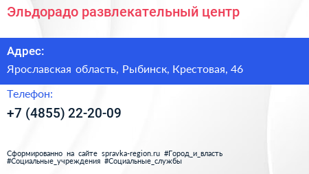 Эльдорадо, развлекательный центр по адресу Ярославская область, Рыбинск, Крестовая, 46 в дальнейшем Организация, размещена в следующих категориях: