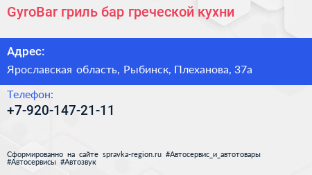 GyroBar, гриль-бар греческой кухни по адресу Ярославская область, Рыбинск, Плеханова, 37а в дальнейшем Организация, размещена в следующих категориях: