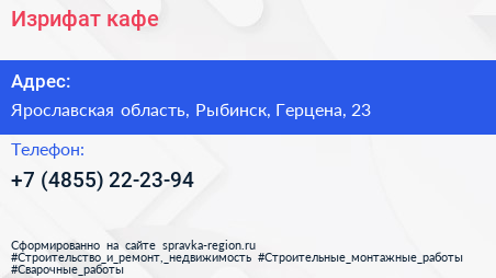 Изрифат, кафе по адресу Ярославская область, Рыбинск, Герцена, 23 в дальнейшем Организация, размещена в следующих категориях: