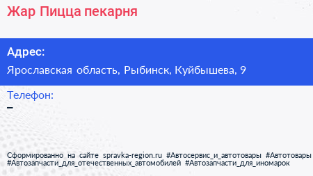 Жар Пицца, пекарня по адресу Ярославская область, Рыбинск, Куйбышева, 9 в дальнейшем Организация, размещена в следующих категориях: