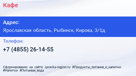 Кафе по адресу Ярославская область, Рыбинск, Кирова, 3/1д в дальнейшем Организация, размещена в следующих категориях: