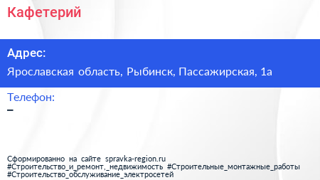 Кафетерий по адресу Ярославская область, Рыбинск, Пассажирская, 1а в дальнейшем Организация, размещена в следующих категориях: