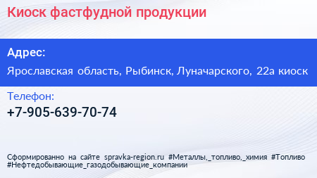 Киоск фастфудной продукции по адресу Ярославская область, Рыбинск, Луначарского, 22а киоск в дальнейшем Организация, размещена в следующих категориях: